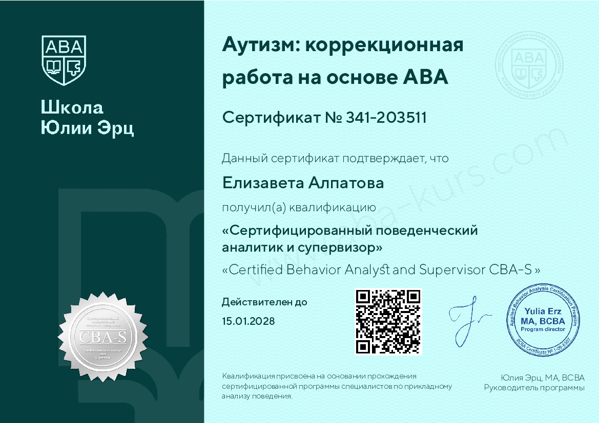 - Сертификационная программа профессиональной переподготовки поведенческих аналитиков проекта "Аутизм: коррекционная работа", 2021;- Практический функциональный анализ и тренинг с опорой на навыки. Gregory P. Hanley, Ph. D., BCBA-D, LABA FTF Behavioral Consulting, 2021;