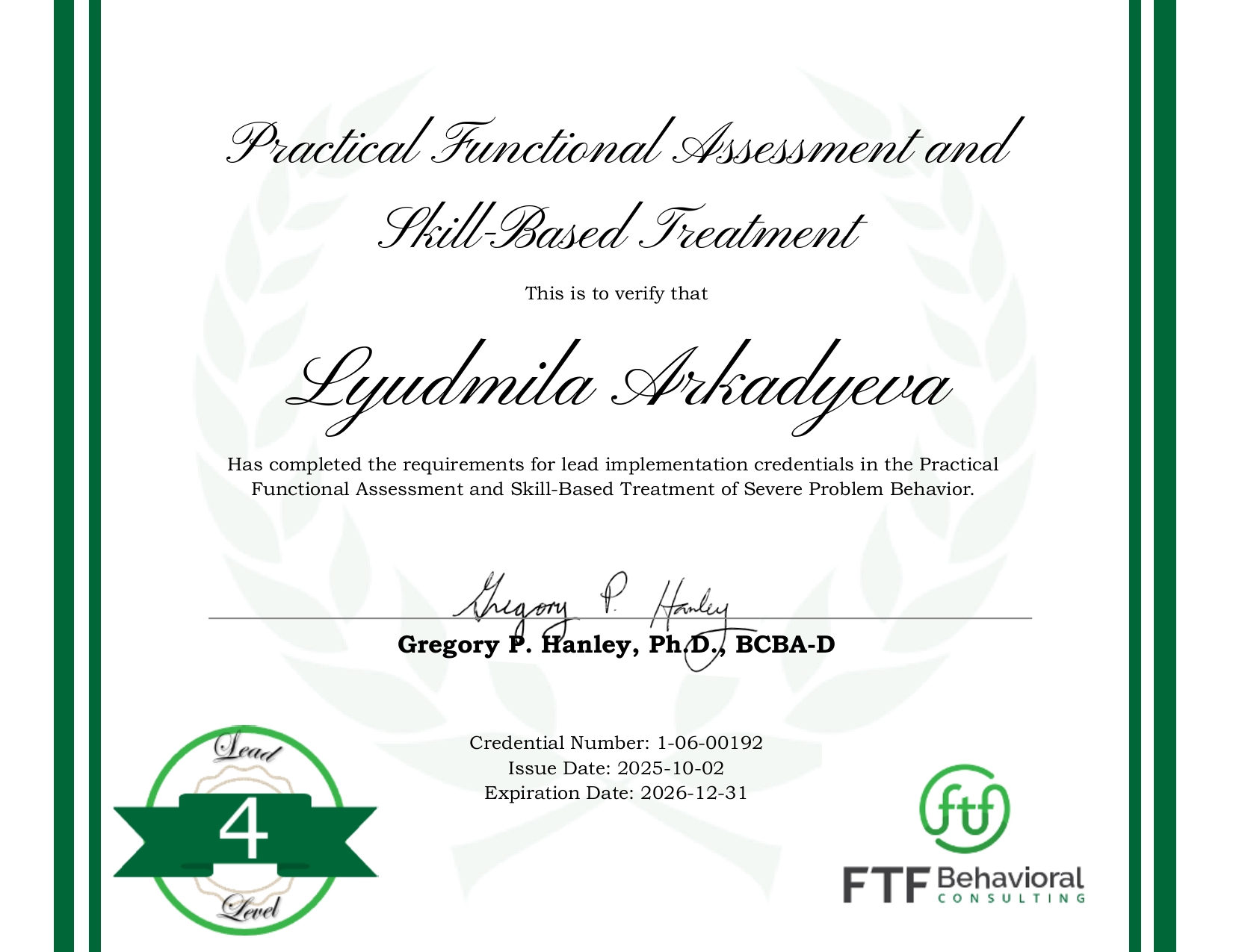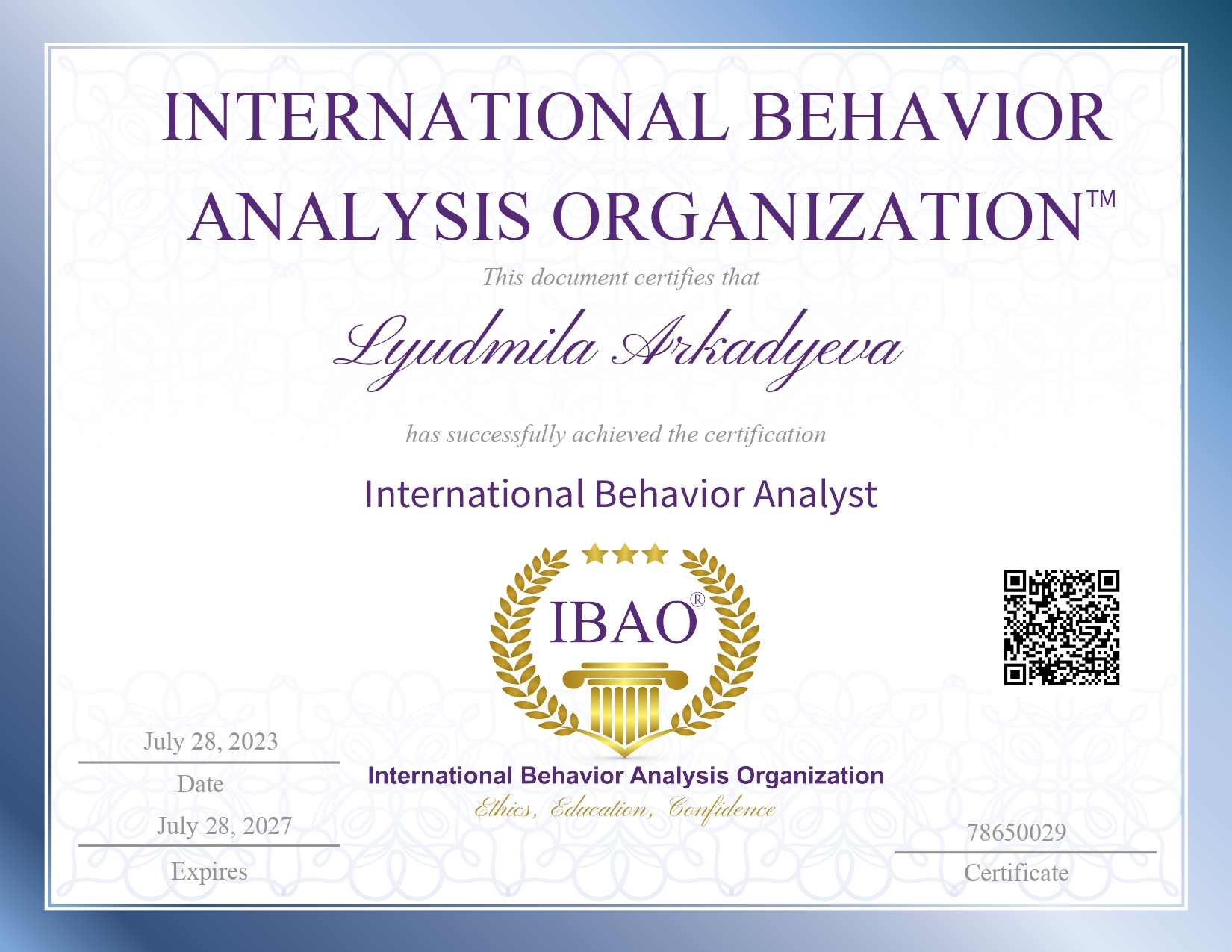 - Сертификационная программа профессиональной переподготовки поведенческих аналитиков проекта "Аутизм: коррекционная работа", 2020;