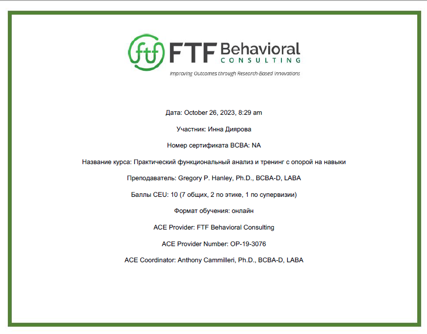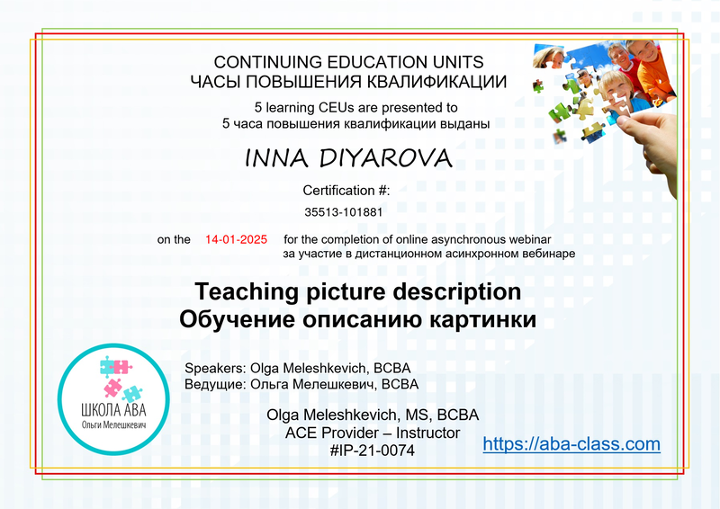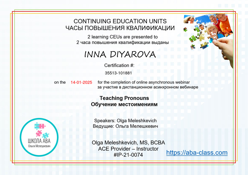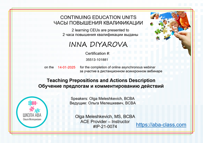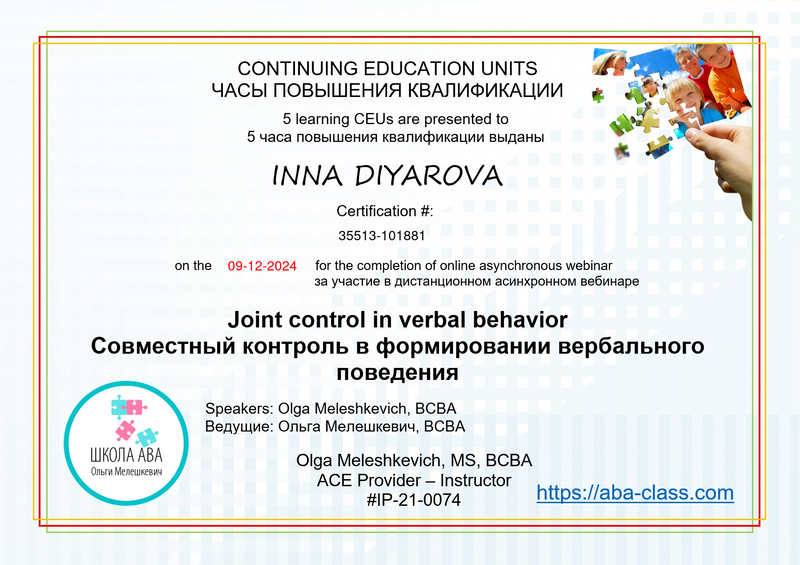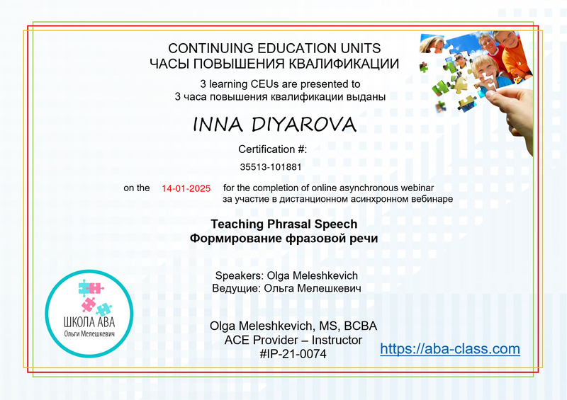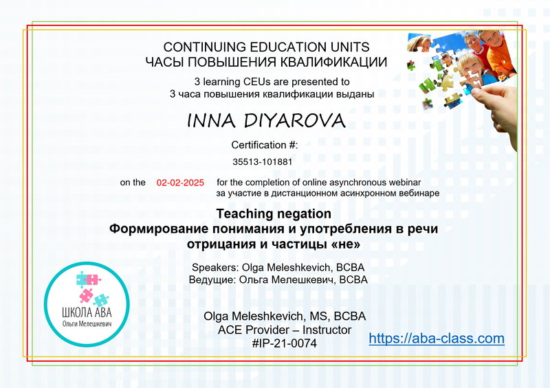 Высшее, 44.04.03 «Специальное (дефектологическое) образование» , присвоена квалификация магистрДополнительное образование в сфере АВА