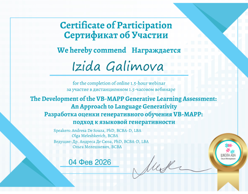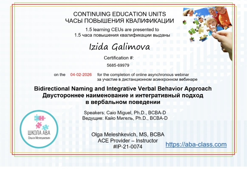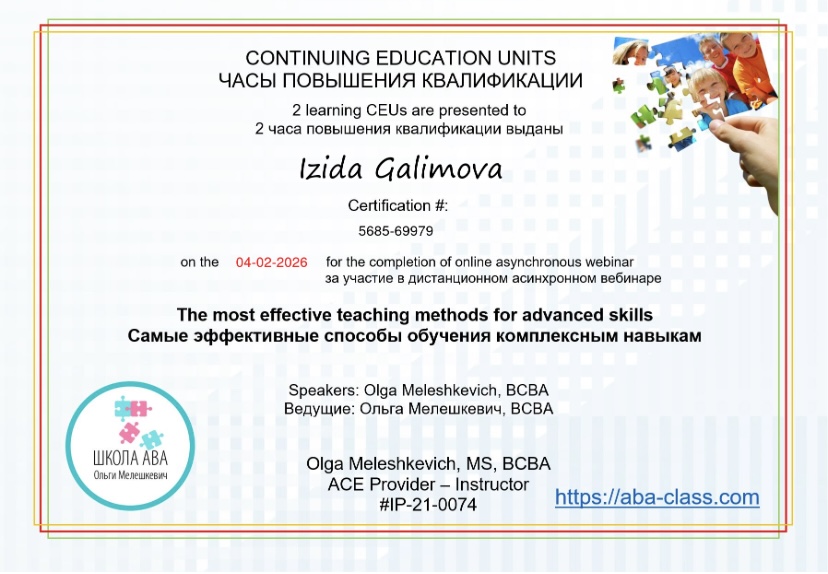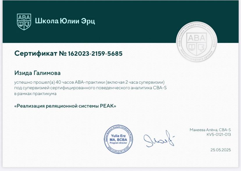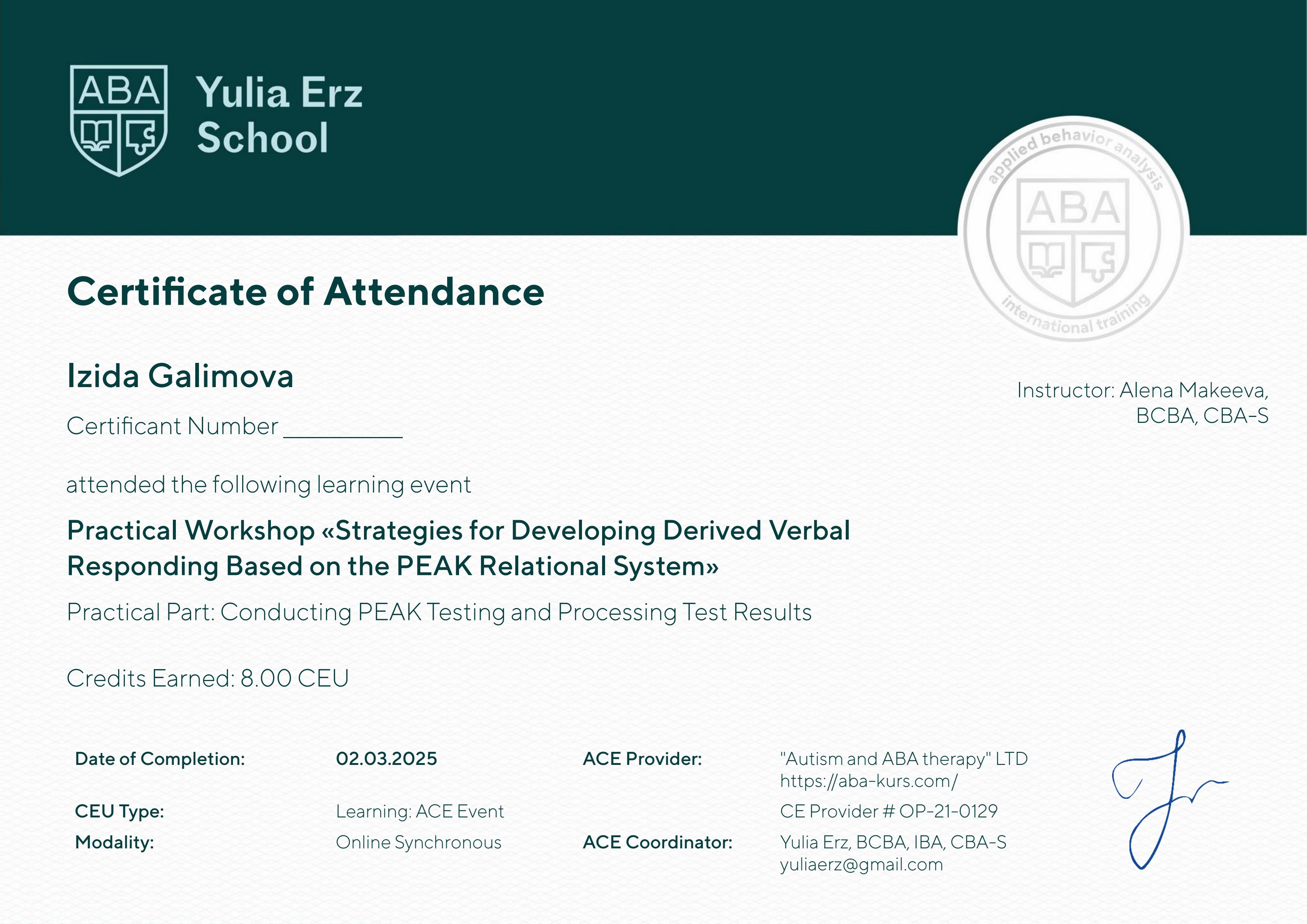 Применение базовых АВА-стратегий обучения в работе с детьми с РАС, Применение оценки VB-MAPP и выбор целей для поведенческой программы, Применение практического функционального анализа для работы с проблемным поведениемСпециализация и сфера профессиональных интересов
