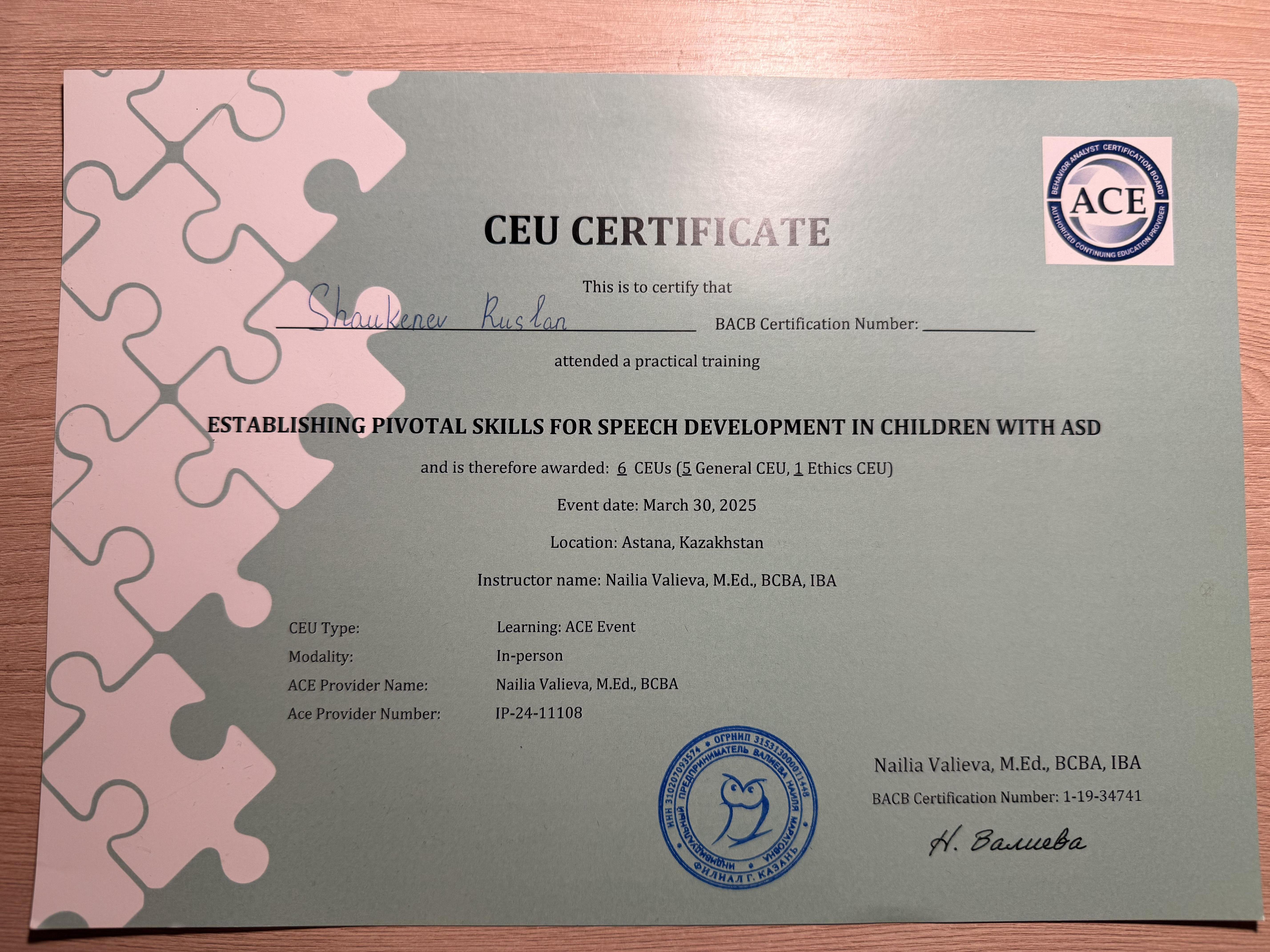 30.03.2025 Формирование ключевых навыков для развития речи у детей с РАС, в объеме 7 часов. Ведущий тренинга ВСВА Наиля ВалиеваВысшее, психолог