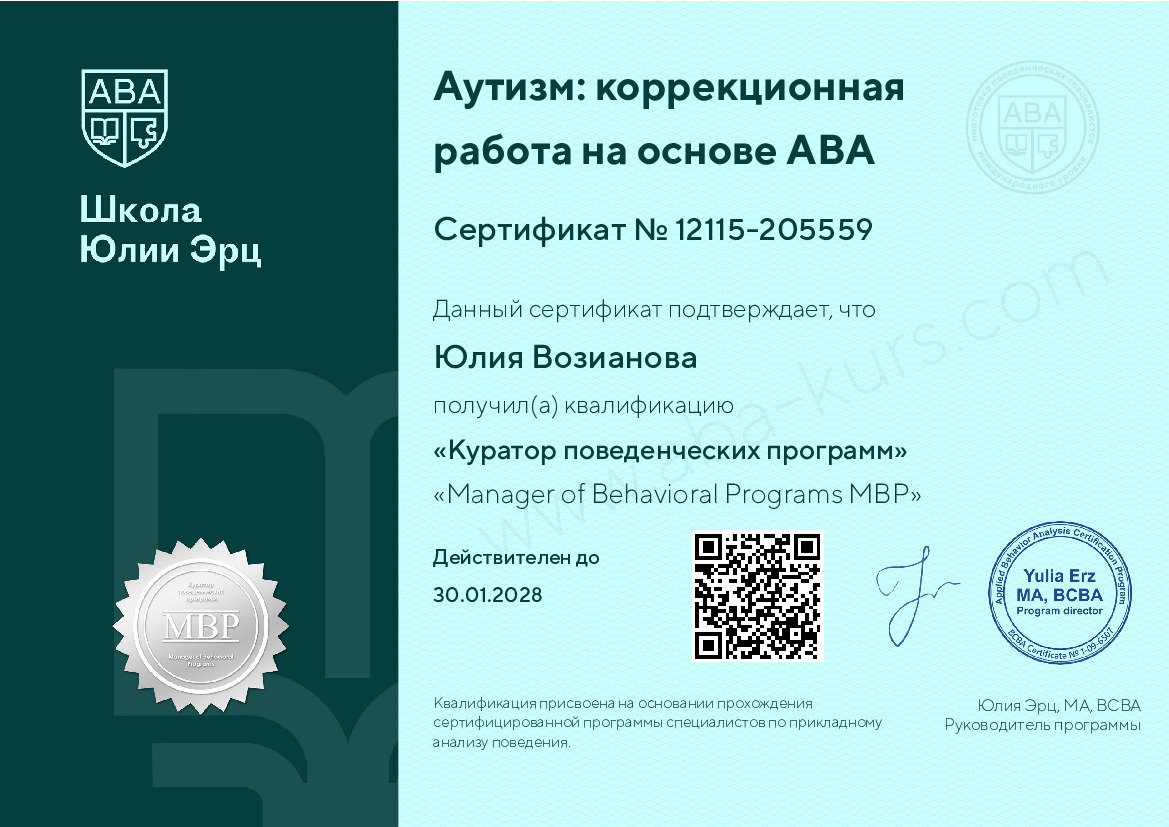 Высшее, педагогическоеДополнительное образование в сфере АВА